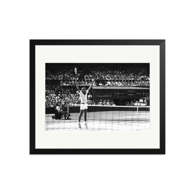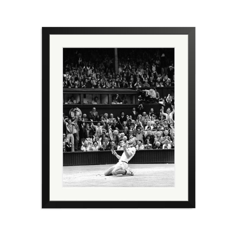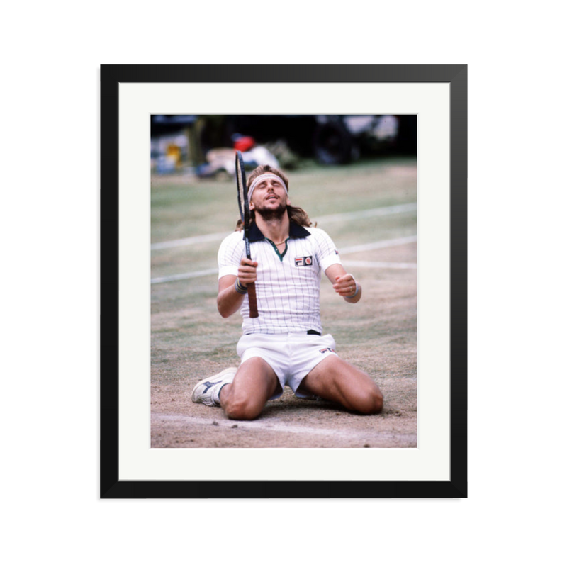 Sweden's Bjorn Borg sinks to his knees on the Centre Court at Wimbledon when he won his fifth successive men's singles title with a thrilling five sets victory over 21-year old American John McEnroe.